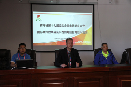 2018年5月22日,省体育局反兴奋剂中心工作人员赴互助县全民健身中心综合馆,开展2018年省体育局反兴奋剂专题教育暨十七届省运会摔跤项目准入培训,参加省运会摔跤比赛的近200名运动员、教练员和辅助人员参与了本次培训。