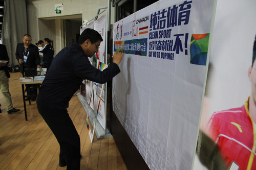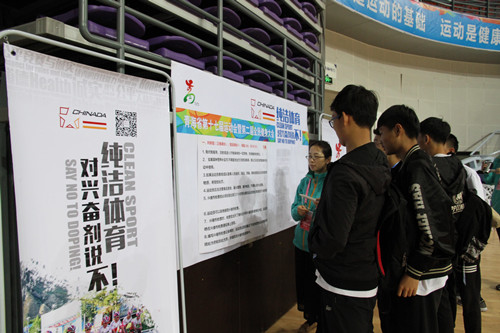 省体育局副巡视员、省运会反兴奋剂工作部部长高学林,省体育局竞技体育处处长、竞委会主任文卫东,省排球运动协会主席金山及相关领导参加了“对兴奋剂说不”的主题签名活动。活动现场搭设了反兴奋剂教育展板,滚动播放反兴奋剂教育宣传片,气氛热烈,参与度高,运动员、辅助人员和教练员踊跃利用手机微信客户端现场参与有奖互动知识问答、签名及拍照留影等活动,蒙古族运动员们还用蒙语叫响了“纯洁体育,对兴奋剂说不”的活动口号。